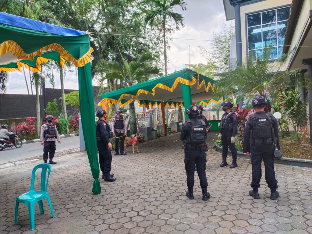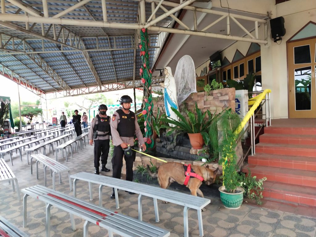 PONTIANAK, KALBAR – K9 Ditsamapta Polda Kalbar bersama Gegana Brimob Polda Kalbar melaksanakan sterilisasi gereja yang digunakan sebagai tempat ibadah umat kristiani pada hari Sabtu 24 Desember 2022